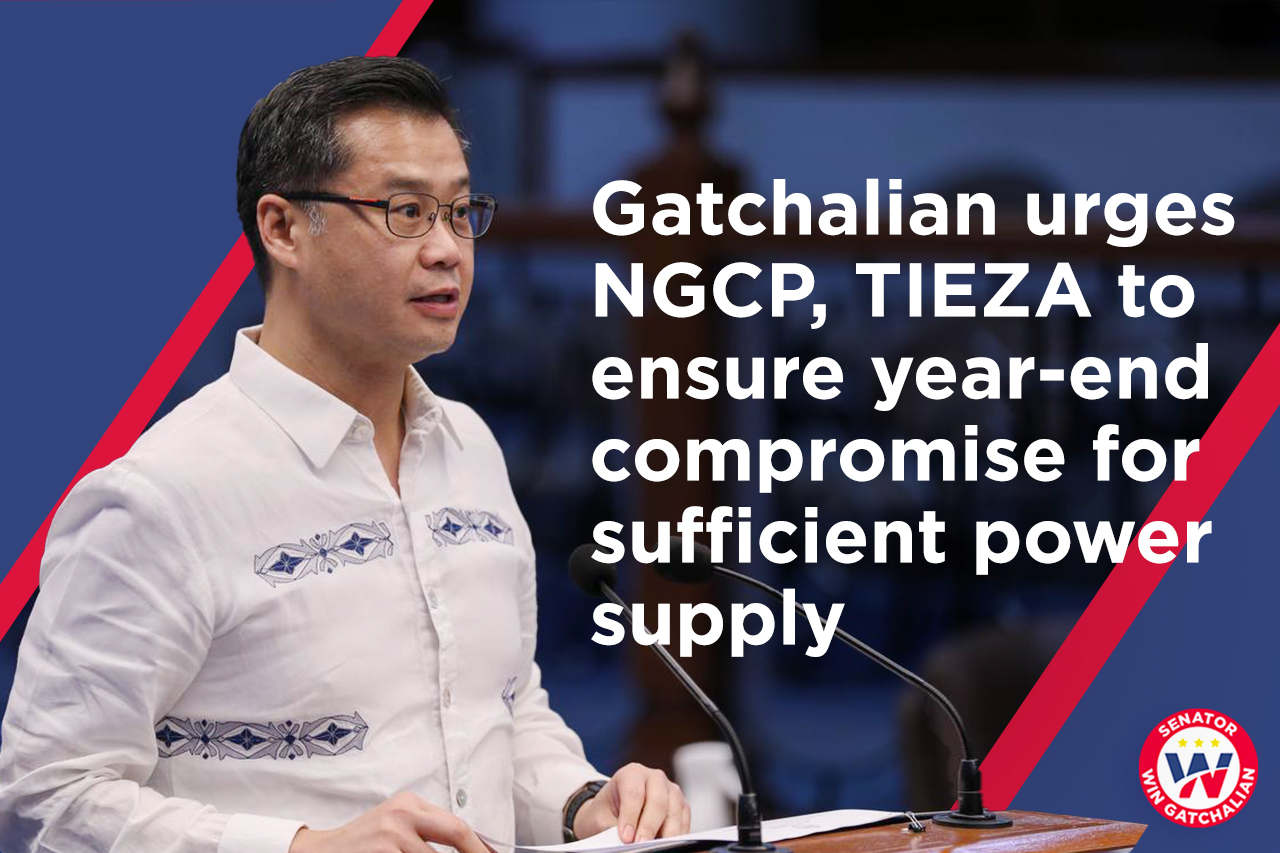 Senator Win Gatchalian urged the National Grid Corporation of the Philippines (NGCP) and the Tourism Infrastructure and Enterprise Zone Authority (TIEZA) to ensure that a compromise agreement to resolve a conflict relating to the construction of two transmission towers is finalized by year-end.