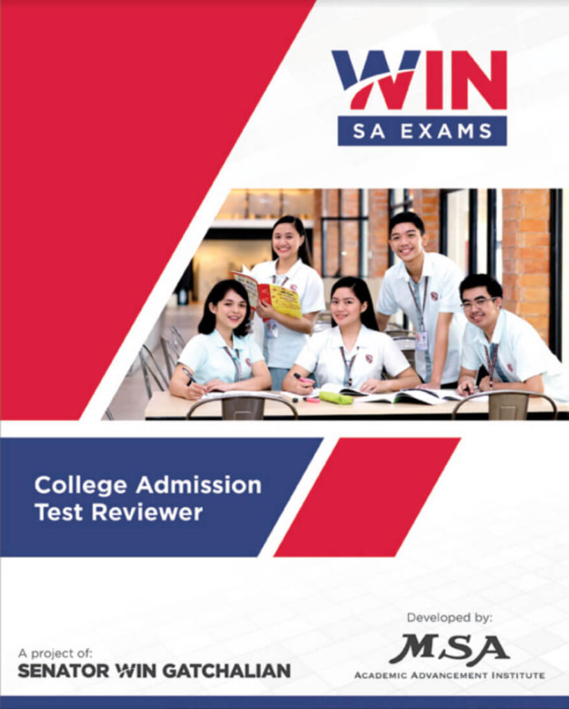 Hayaang magabayan at matuto sa pinaganda at pinadaling konsepto ng pag-review para sa bawat kabataang kakatapos lang ng high school, ‘tulad na lang ng ating proyektong WIN SA EXAMS College Admission Test Reviewer kasama ang MSA Academic Advancement Institute. Paglaanan ng sapat na oras na sagutan ang bawat paksang nakapaloob dito para mapaghandaang maigi ang entrance exam saan mang kolehiyo nais ninyong pumasok.